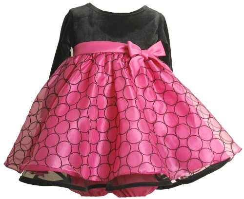 This beautiful long-sleeved black and fuschia pink party dress & diaper cover 2pc set for your baby girl from Bonnie Baby by Bonnie Jean is perfect for Christmas pictures, parties and holiday family gatherings! Dress features black velvet bodice, fuschia pink organza skirt with black flocked circles accented with silver glitter dots for the extra sparkle! Fuschia pink satin trim with bow detail on the front at empire waist. Underskirt with tulle ruffle for added fullness. 1-button closure on the back. Comes with matching fuschia pink diaper cover.