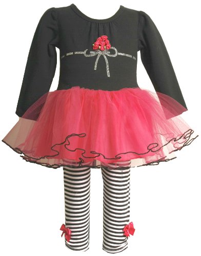 Up for your consideration is this adorable Fall dress set from Bonnie Baby (line of Bonnie Jean). This dress outfit features black knit long sleeve top, center chest area is decorated with tiny rhinestone arranged in a 'bow pattern' with an assortment of pink fabric roses on top of the bow, triple layer pink skirt (top two layers are in pink tulle fabric with black trim and underneath layer is solid organza pink), and comes with a matching black / white legging w/ side pink satin bows . A terrific dress outfit for your little one to wear during the Fall season. Dress top is 95% cotton & 5% spandex and skirt is 100% nylon, and leggings is 60% cotton & 40% polyester.