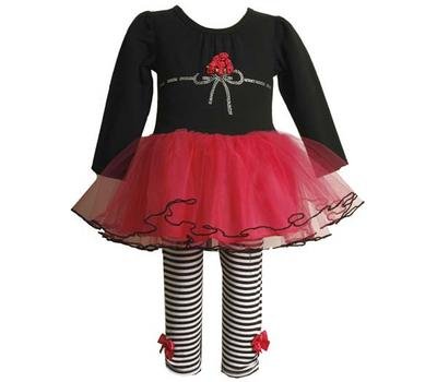Up for your consideration is this adorable Fall dress set from Bonnie Baby (line of Bonnie Jean). This dress outfit features black knit long sleeve top, center chest area is decorated with tiny rhinestone arranged in a 'bow pattern' with an assortment of pink fabric roses on top of the bow, triple layer pink skirt (top two layers are in pink tulle fabric with black trim and underneath layer is solid organza pink), and comes with a matching black / white legging w/ side pink satin bows . A terrific dress outfit for your little one to wear during the Fall season. Dress top is 95% cotton & 5% spandex and skirt is 100% nylon, and leggings is 60% cotton & 40% polyester.