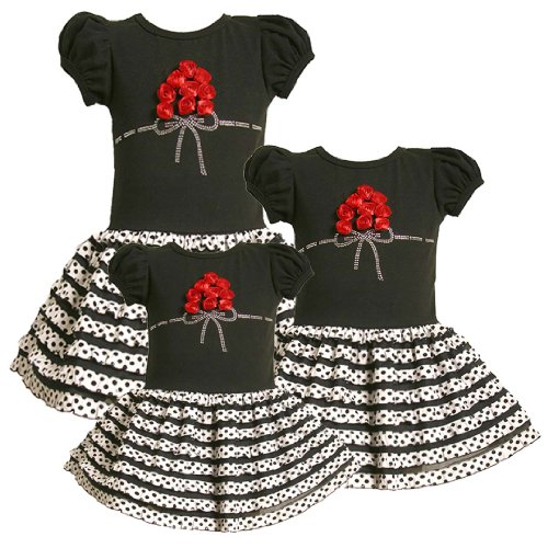 - BLACK & WHITE TIERED RUFFLE DROP WAIST DRESS features gently puffed short sleeves and SOLID BLACK KNIT BODICE adorned with RED ROSETTE-RIBBON BOUQUET and SPARKLING RHINESTONE ACCENTS.