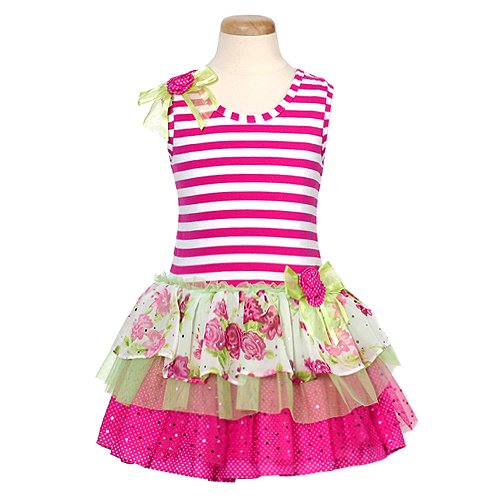 A darling summer dress by Bonnie Jean for your little girl. Sleeveless dress featuring fuchsia/white striped bodice, green bow with dotted rolled rose applique on one shoulder, tiered glitter-accented mesh multi floral/dotted red skirt with green bow and dotted center rolled rose applique on the drop waist.