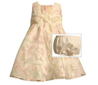 Up for your consideration is this beautiful dress from Bonnie Jean. This lightweight ivory dress features 'burnout' floral overlay design throughout, gathered at the middle bodice, ivory organza front sash with three bonaz flower at the high waist line, same floral burnout fabric ties in the back, zipper back closure, fully lined ivory organza fabric underneath, and comes with a matching ivory panty. Just a wonderful dress to be worn during Easter, Spring, or at any special occasion. Bonnie Jean is a great brand sold in high end department stores.